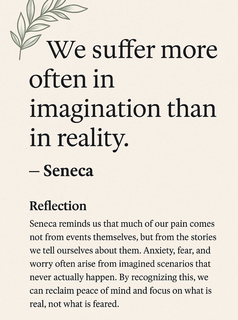 Seneca’s quote is not just a warning—it’s an invitation. An invitation to step off the mental stage, close the curtains on imagined suffering, and walk into the quiet clarity of reality. When we do, we find that life is lighter than our fears, and peace is closer than we think.